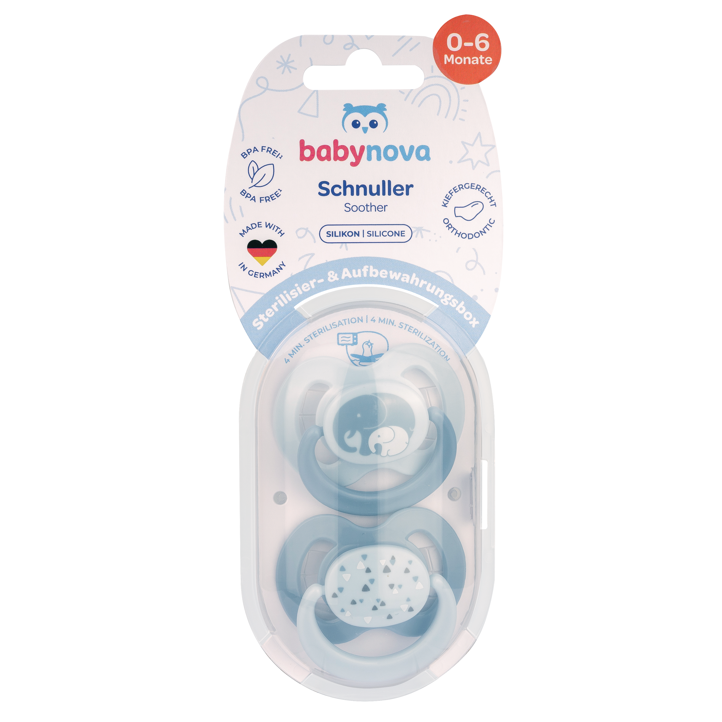Baby Nova Suzeta multicolora cu inel, producator Novatex, Germania, este destinata bebelusilor cu varsta 0-6 luni. Suzeta este ortodontica si contribuie la dezvoltarea naturala a maxilarului bebelusilor. Este sigura si igienica, din materiale care nu contin BPA (bisfenol).