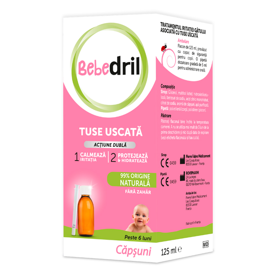 Indicații:Siropul Bebedril este un sirop fără zahăr, fără coloranţi şi fără parabeni, cu aromă de căpşuni. Calmează iritaţia asociată cu tusea uscată, îmbrăcând mucoasa gâtului cu un înveliș protector și emolient. Bebedril a fost conceput special pentru a fi administrat bebeluşilor începând cu vârsta de 6 luni şi copiilor de până la 6 ani.