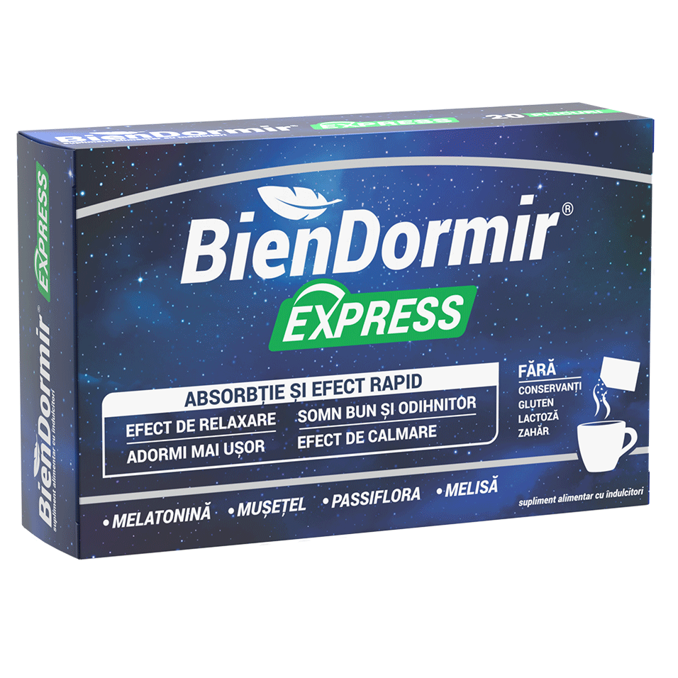 Conceput sub formă de pulbere pentru soluție orală care se absoarbe ușor și cu un conținut maxim de melatonină, alături de extracte vegetale standardizate, Bien Dormir EXPRESS vine în ajutorul persoanelor cu dificultăți de adormire, asigurând instalarea mai rapidă a somnului.