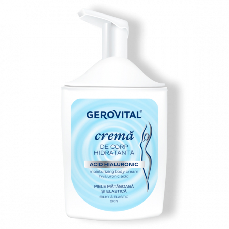 Gerovital Crema hidratanta de Corp - Acid Hialuronic imbunatateste textura pielii, creste gradul de hidratare si elasticitatea acesteia. Complexul de Acid Hialuronic, Aquaxyl si vitamine (Pantenol si Vitamina E) actioneaza dual: atat la suprafata pielii cat si in interiorul dermului, asigurand hidratarea optima, protectia si regenerarea pielii. Uleiul de migdale si untul de shea aduc pielii un aport de nutrienti naturali.