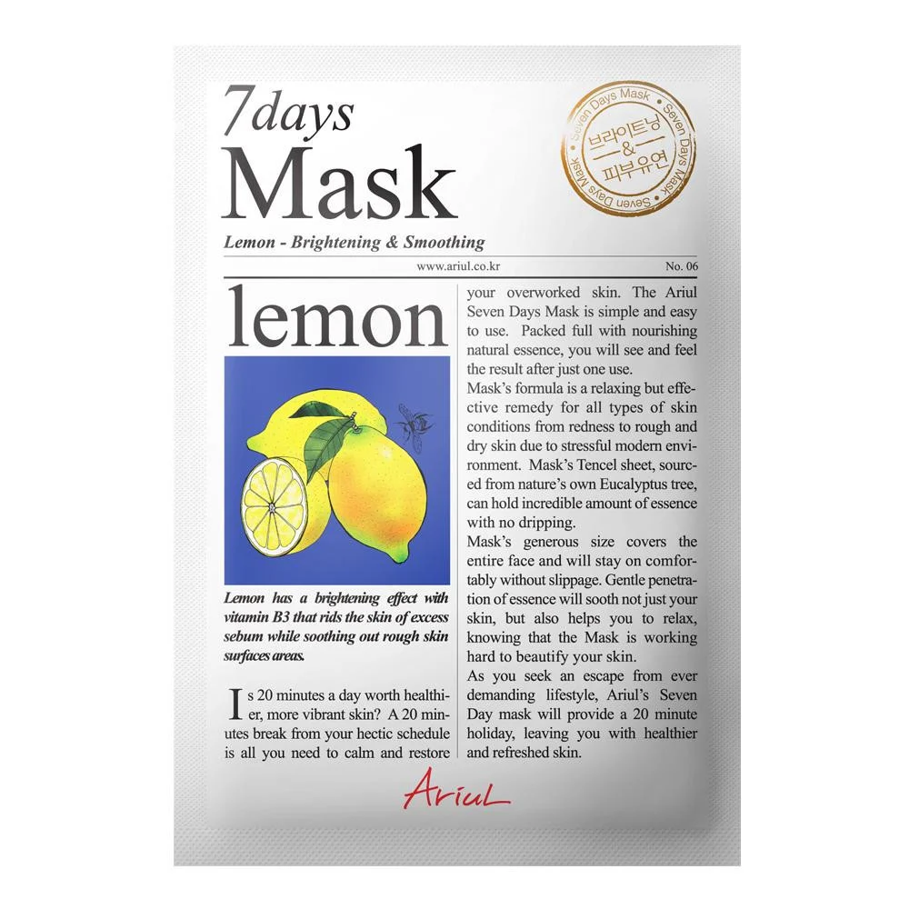 Cel mai popular produs marca Ariul, Ariul 7Days Mask, in varianta cu Lamaie, contine niacinamide, pentru a lumina tenul obosit si pentru a controla productia de sebum pentru o piele mai stralucitoare si purificata. Efectul de prospetime se va resimti dupa 20 de minute de utilizare a mastii, indiferent de tipul de ten asupra caruia actioneaza. Formula mastii 7Days Mask Lamaie este un remediu relaxant dar eficient pentru toate tipurile de probleme ale pielii cauzate de stilul de viata modern. De la roseata pana la lipsa de hidratare. Evadeaza 20 de minute din cotidian pentru un ten sanatos si reimprospatat.
