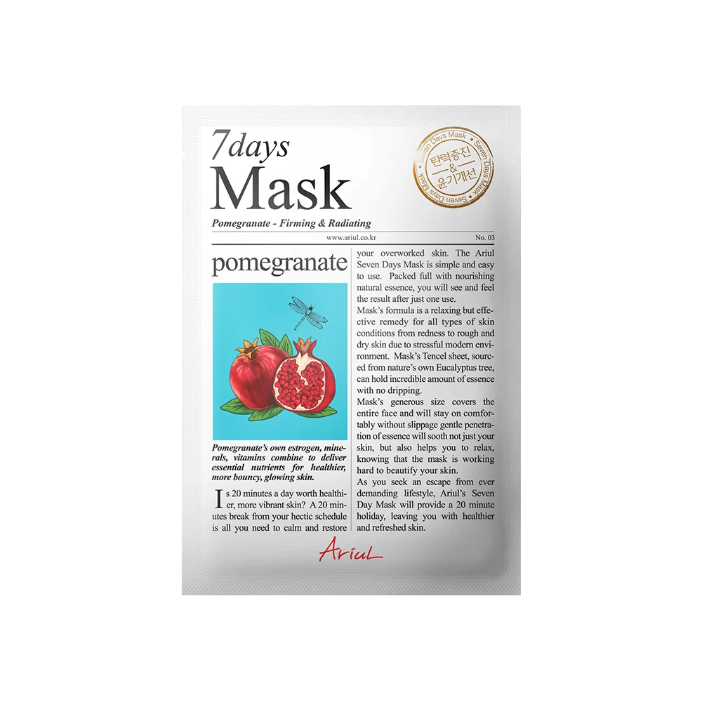 Cel mai popular produs marca Ariul, 7Days Mask, in varianta cu Rodie, CONTINE din abundenta estrogen, aminoacizi, minerale si vitamine, pentru a hrani si a restabili elasticitatea specifica tenului tanar, avand ca efect o piele care radiaza. Rodia stimuleaza productia de colagen si are proprietati anti-imbatranire, antirid si antiinflamatoare. Formula mastii 7Days Mask Rodie este un remediu relaxant dar eficient pentru toate tipurile de probleme ale pielii cauzate de stilul de viata modern. De la roseata pana la lipsa de hidratare. Evadeaza 20 de minute din cotidian pentru un ten sanatos si reimprospatat