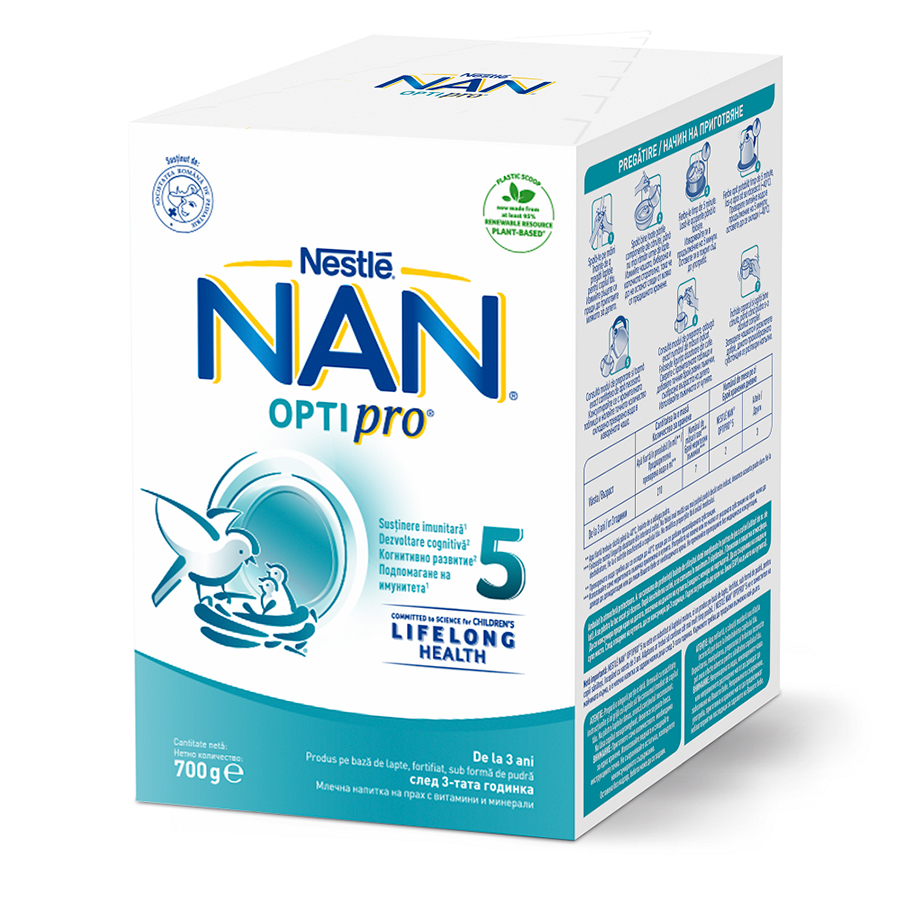 NESTLÉ NAN® OPTIPRO® 5 este special conceput pentru a contribui la o nutriție echilibrată și adecvată copiilor cu vârste de peste 3 ani. La această vârstă, copiii devin mai activi, merg la gradiniță, se joacă, învață și continuă să aibă nevoi nutriționale specifice.