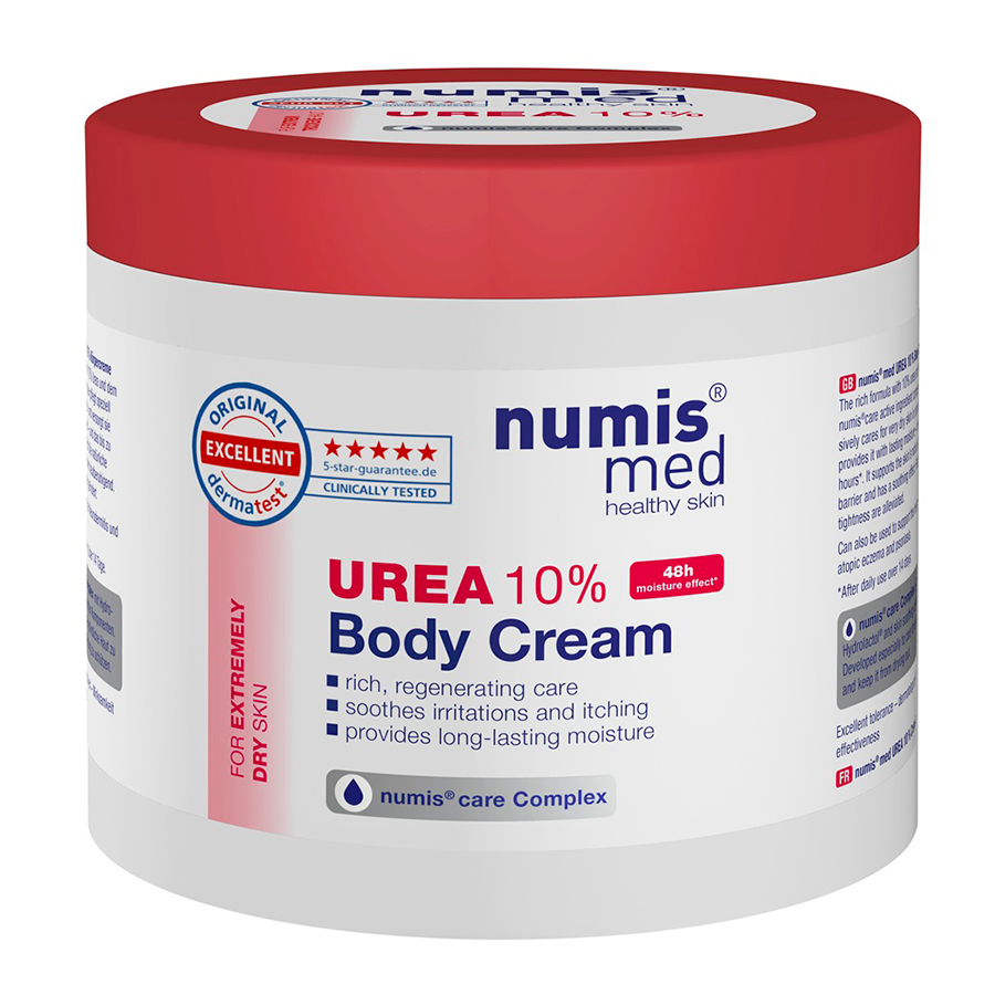 Numis Med crema corp UREA 10% , 400ml. Prin proprietatile lor de hidratare intensa, ureea si glicerina protejeaza pielea pentru o perioada indelungata, eliminand astfel descuamarea,rugozitatea si tensiunea pielii foarte uscate,ducand la disparitia pruritului(mancarime). Ingrijire de tip medical.Ideal pentru pielea sensibila la alergii .Utilizarea regulata imbunatateste capacitatea pielii de a-si mentine nivelul de hidratare pana la 48 de ore dupa utilizare , aceasta redevenind elastica si cu un aspect sanatos. Fara parfum, silicon, uleiuri minerale, microplastice si parabeni. Aqua (apă), uree, stearat de etilhexil, ulei hibrid de Helianthus Annuus (ulei de semințe de Helianthus Annuus (floarea-soarelui), glicerină, palmitat de izopropil, diizostearat de poligliceril-4/polihidroxistearat/sebacat, scualan, serină, propamido-acid hidrobenzobilic palmitat, acid hidroxifenoxilic Ulei de flori de Nobilis, ulei de ricin hidrogenat, alcool fenetilic, sorbitol, triacetină, alcool denat., pentilen glicol, benzoat de sodiu, etilhexilglicerină, lactat de sodiu, sulfat de magneziu, acid lactic, butilenglicol, clorură de sodiu