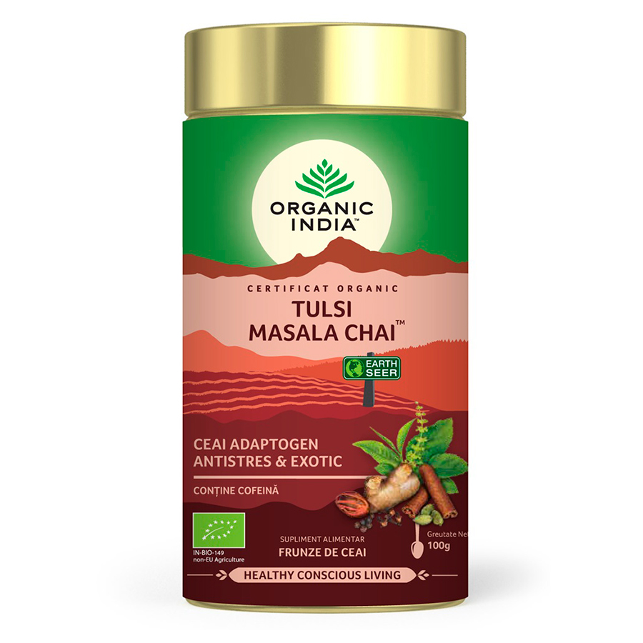 ORGANIC INDIA Tulsi (Busuioc Sfant) Masala Chai, Relaxant & Regenerant, realizat din cel mai fin ceai negru, combinat cu amestecul extraordinar de condimente nutritive si delicioase si cu "Incomparabilul" Tulsi, transforma acest Chai intr-o experienta autentica, savuroasa, desavarsita, fina si plina de sanatate.