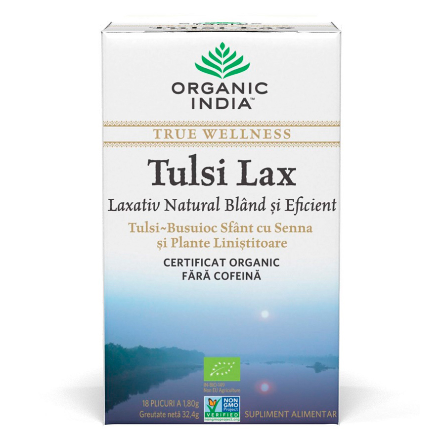 ORGANIC INDIA Ceai Tulsi Lax (Busuioc Sfant), Laxativ Natural Bland si Eficient este un produs 100% Certificat Organic si nu contine organisme modificate genetic. Nu contine si nu sunt folosite in niciun stagiu al productiei pesticide sintetice, erbicide, ingrasaminte sau alte tratamente chimice.