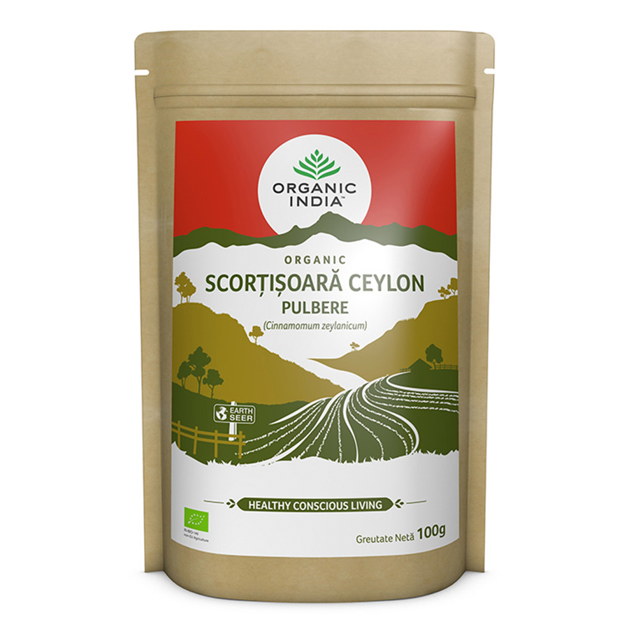 ORGANIC INDIA Scortisoara Ceylon Certificata Ecologic Pudra, fara Gluten este un produs 100% Certificat Organic si nu contine organisme modificate genetic. Nu contine si nu sunt folosite in niciun stagiu al productiei pesticide sintetice, erbicide, ingrasaminte sau alte tratamente chimice.