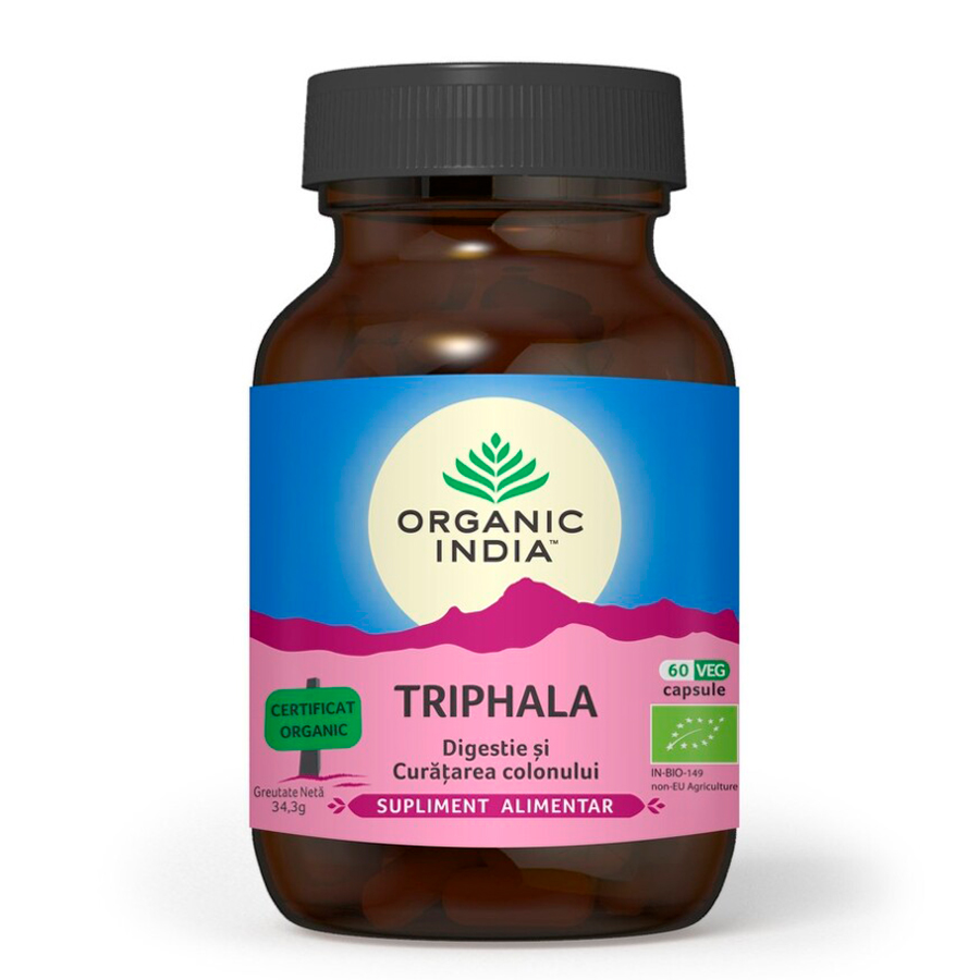 ORGANIC INDIA Triphala, Digestie&Curatare Colon este un supliment alimentar din plante 100% Certificate Organic, ce sprijina detoxifierea organismului si curata intreg tractul gastrointestinal, imbunatatesc digestia si sustin eliminarea toxinelor si a depozitelor de grasime din intestine.