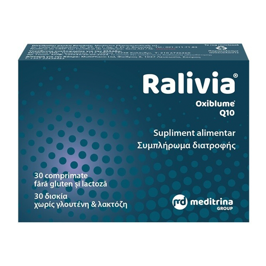Fiecare comprimat de Ralivia contine: Oxiblume (Gastrodia elata, rizom, d.e. tit. 10% polizaharide) 200 mg, agenti de ingrosare: celuloza microcristalina, fosfat dicalcic dihidrat, polivinilpirolidona, Coenzima Q10 (CoQ10) 20 mg, agenti de glazurare: hidroxipropilmetilceluloza, talc, polietilen glycol, agenti antiaglomeransi: dioxid de siliciu, saruri de magneziu ale acizilor grasi.