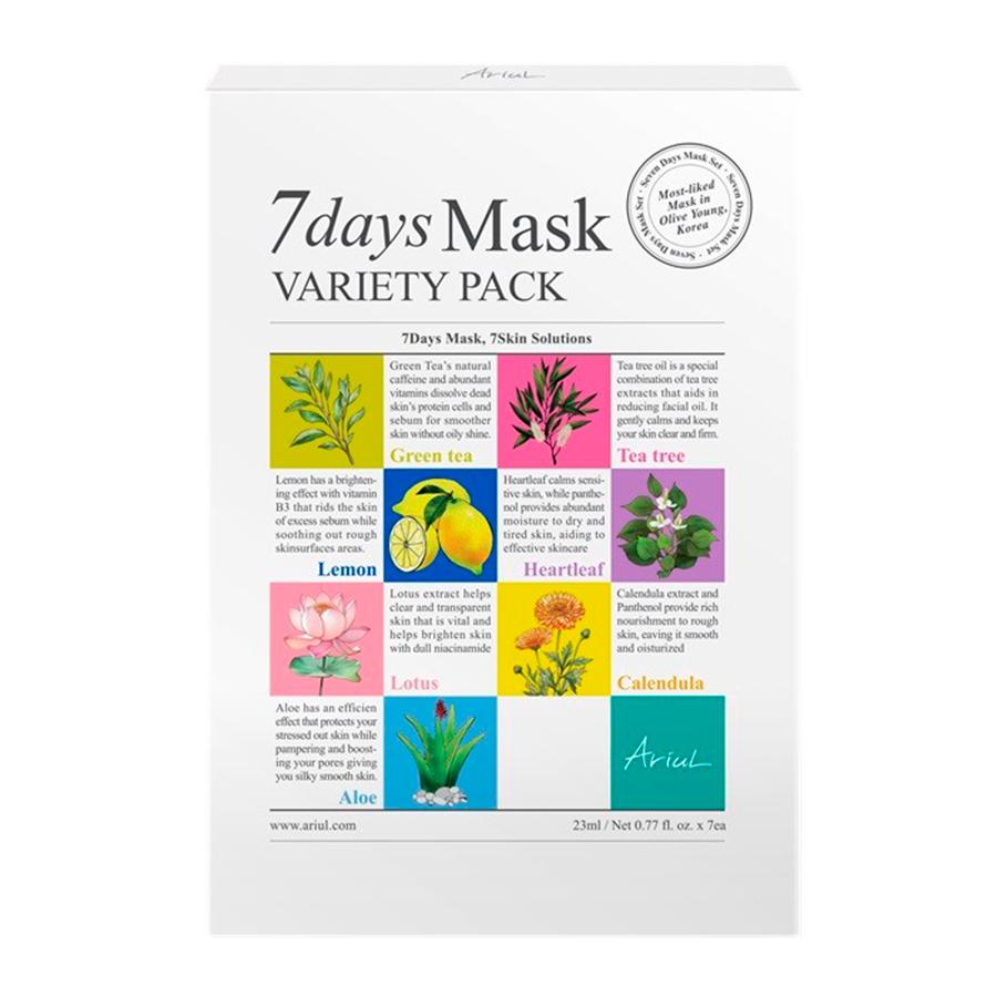 Cele mai populare masti coreene Ariul, Ariul 7Days Masks, in cele sapte variante, sunt disponibile si sub forma de set, pentru un tratament saptamanal complet al tenului supus stresului cotidian al vietii urbane.