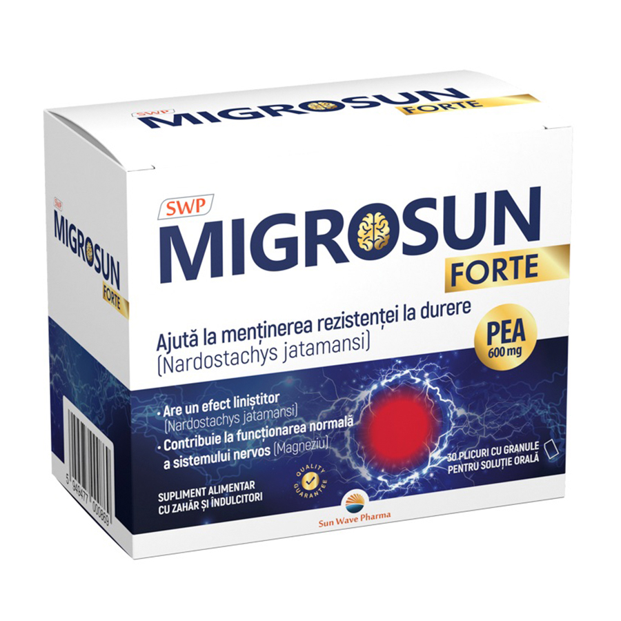 SWP Migrosun Forte este un supliment alimentar ce contine 600 mg PEA, care activeaza sinteza unor substante modulatoare pentru receptorii neurotransmitatorilor implicati in transmiterea durerii, coenzima Q10, prezenta in celulele organismului, in special a celor cu activitate intensa (creier, inima etc.), magneziu, vitamina D si doua extracte studiate pentru efectul lor pozitiv asupra sistemului nervos.