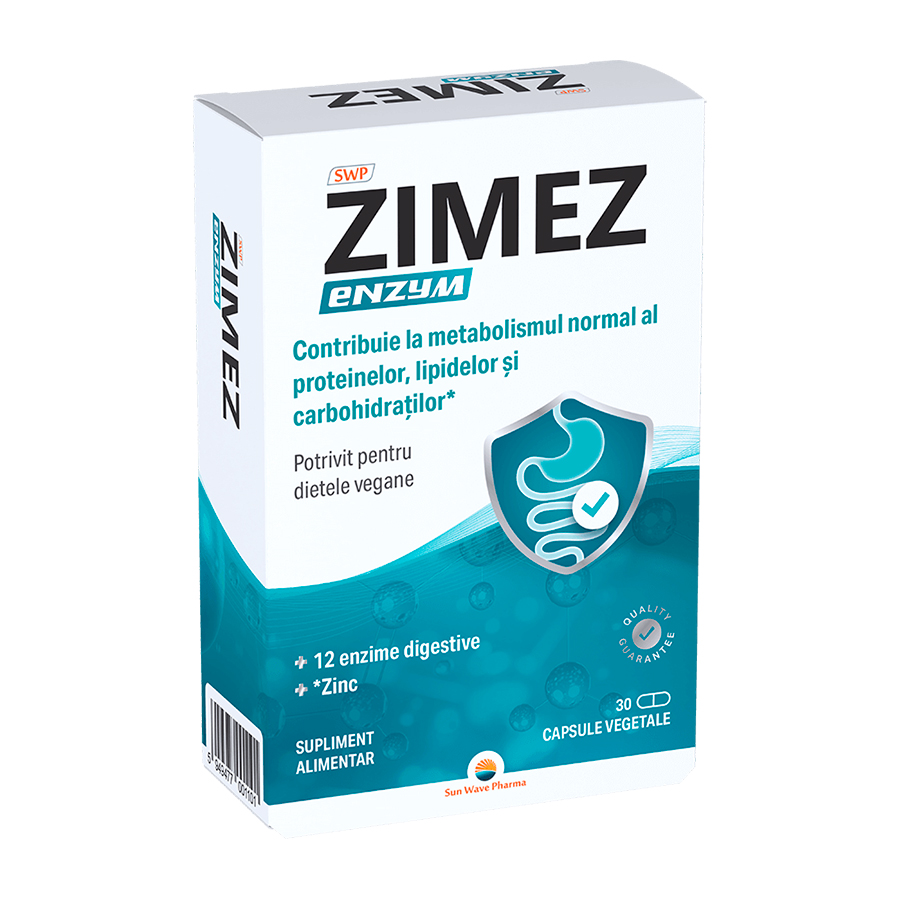 SWP Zimez Enzym este un supliment alimentar cu 12 enzime digestive si zinc sub forma de capsule vegetale cu eliberare modificata pentru a obtine un efect dorit. Enzimele au rolul de a descompune alimentele in componente mai mici, permitand organismului sa absoarba nutrienti.